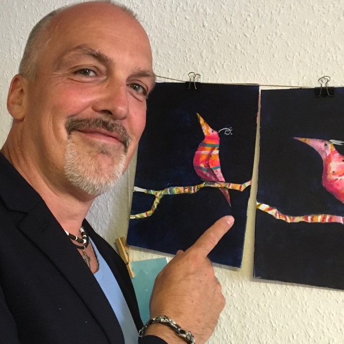 Es war ein schönes Treffen und eine liebevoll vorbereitete Vernissage mit vielen farbenfrohen Acryl-Bildern. Zwei Vögel hatten es mir besonders angetan… 3..2..1..meins!